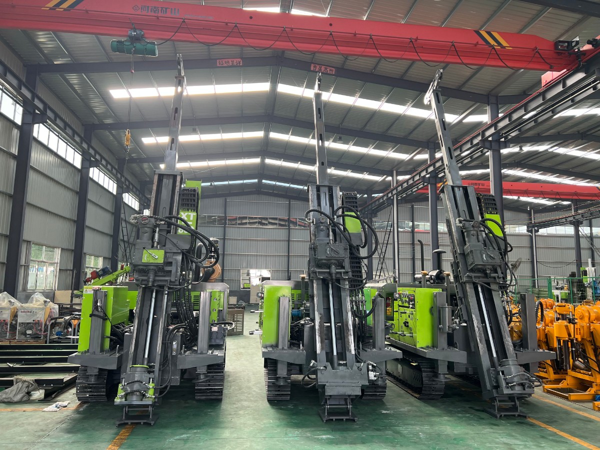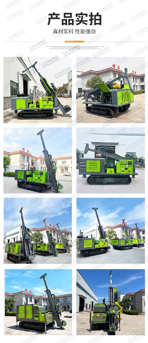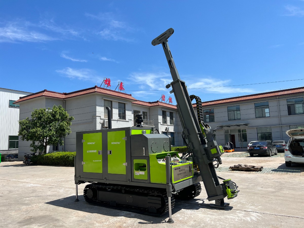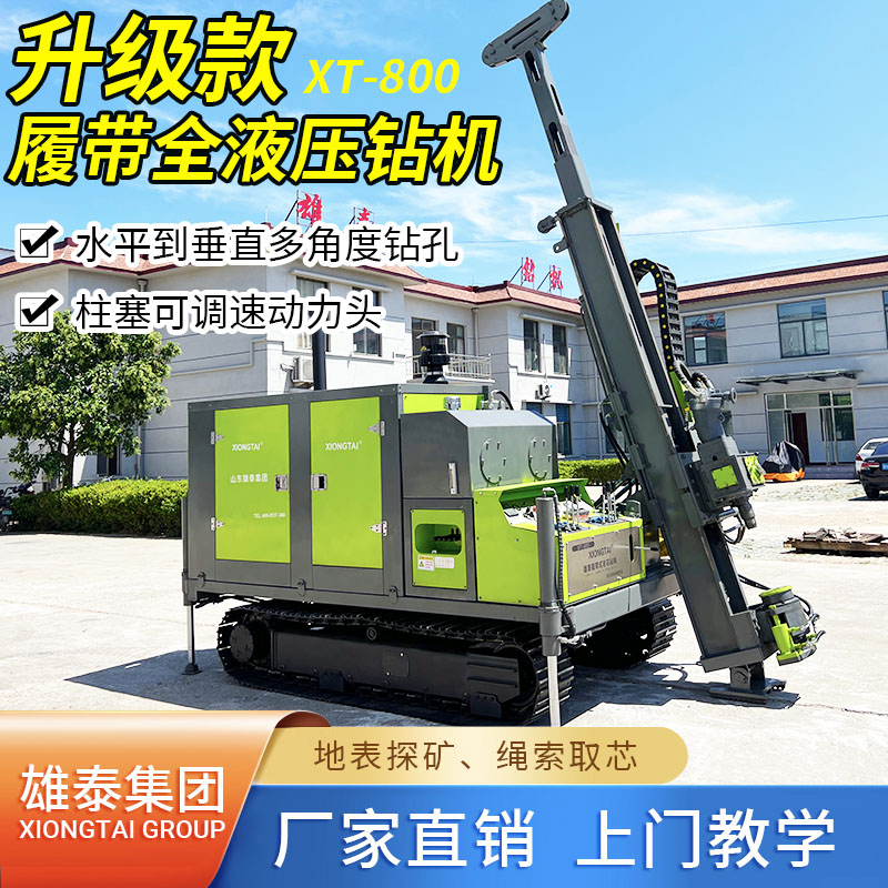 山東雄泰集團(tuán)自主研發(fā)生產(chǎn)的履帶式全液壓鉆機(jī)的無(wú)線遙控行走、液壓桅桿自動(dòng)升起,動(dòng)力頭自動(dòng)左側(cè)移機(jī)提鉆為該款鉆機(jī)一大特色。其中桅桿自動(dòng)升起,動(dòng)力頭移機(jī)為我公司實(shí)用新型專利,極大緩解了現(xiàn)場(chǎng)施工的難度,有效減小了鉆機(jī)施工人數(shù),節(jié)約了成本,該履帶式全液壓鉆機(jī)分別采用76KW/115KW發(fā)動(dòng)機(jī),動(dòng)力強(qiáng)勁,扭矩大,適用于各類(lèi)復(fù)雜地層的金屬礦開(kāi)采。